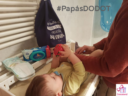 Permíteme que primero te confiese que cuando hace unos días recibimos unos pañales y toallitas de DODOT para probar en casa me sorprendió la mochila en que venían y que rezaba: «Aquí dentro está todo lo que necesita mi PAPÁ».