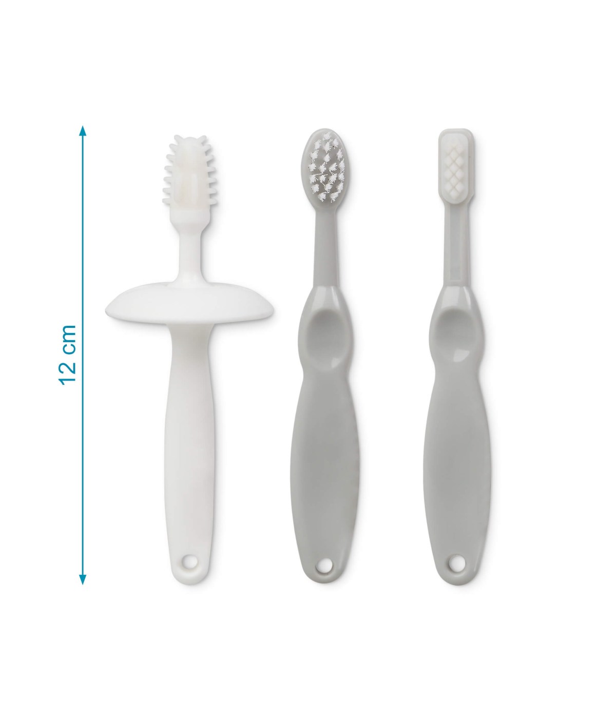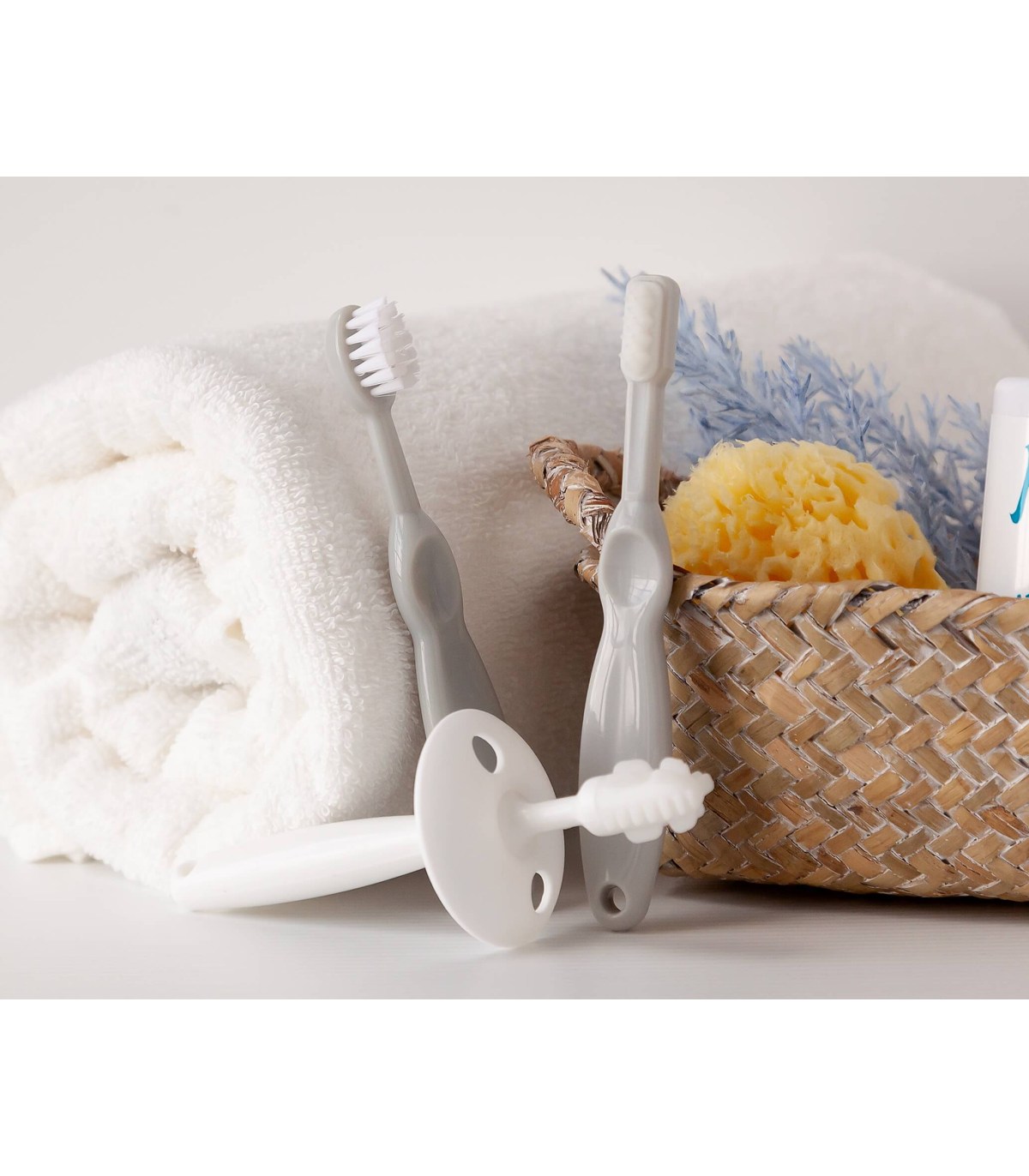 - El último cepillo, el verdadero, deberá empezar a utilizarlo con la aparición de los dientes de leche, a los 2-3 años. En este punto deberás enseñarle las técnicas de cepillado. Consta de mango antideslizante.